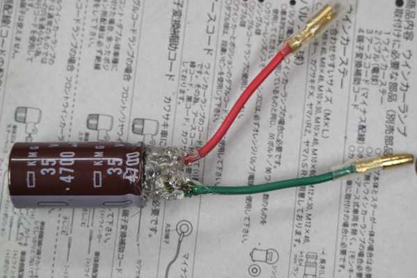 コンデンサーは極性があり足が長い方がプラス、短い方がマイナス、足の長さが分からない場合、本体に白い破線模様がある側がマイナスとなっているので、間違える事はない。端子線にニチブのアルミスリーブで配線と共に圧着し、念のためにハンダも付けておいた。次は絶縁と水の浸入を防ぐためにホットメルトで固める。ギボシを付けた配線をバッテリーのプラスに入る赤とマイナスに入る緑を接続して完成である。