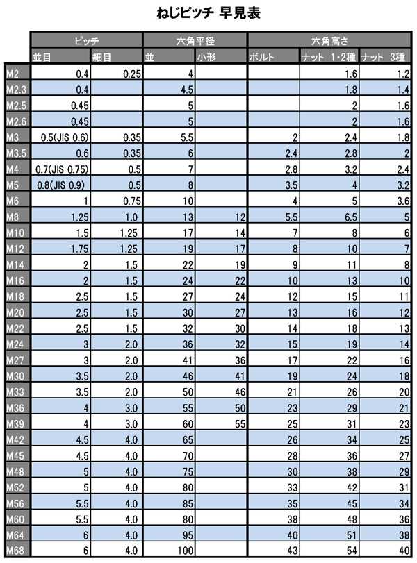 並目と細目のネジピッチは上表の通り