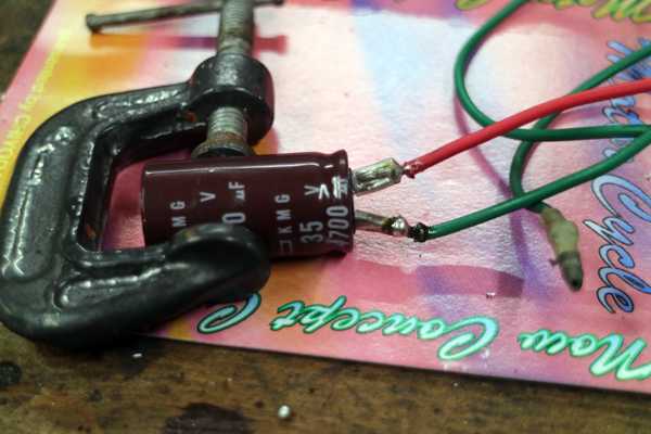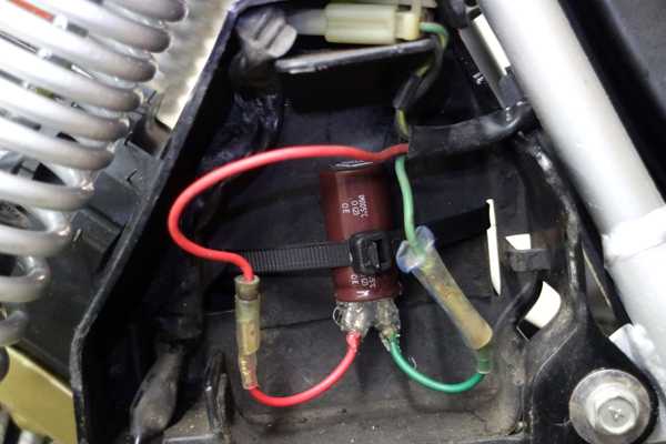 次は電装関係だ。バッテリーレスにするだけなので、6Vバッテリーを外して、代わりにコンデンサーを取り付けるだけである。コンデンサーを取り付ける場合は2800μF以上あれば問題無く作動するようなので、手持ちの4700μFコンデンサーを取り付ける事にした。