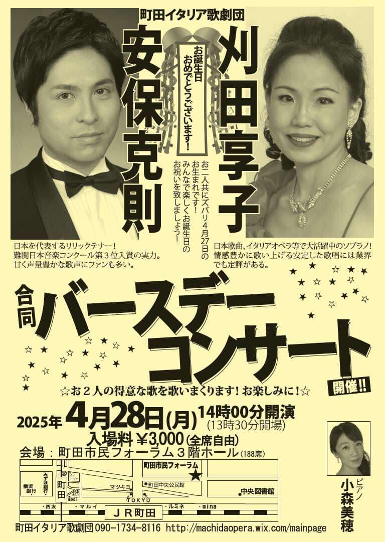 20252024年3月~4月 2025年4月1日 [火] 19:00開演(18:30開場)2025年4月5日 [土] 14:00開演(13:30開場)2025年4月6日 [日] 14:00開演(13:30開場)東京春祭 for Kids子どものためのワーグナー《パルジファル》(バイロイト音楽祭提携公演)[各回約70分]三井住友銀行 東館 ライジング・スクエア1階 アース・ガーデン指揮:石坂 宏パルジファル(テノール):伊藤達人→片寄純也グルネマンツ(バス):山下浩司クンドリ(メゾ・ソプラノ):田崎尚美ティトゥレル(バス・バリトン):狩野賢一管弦楽:東京春祭オーケストラ監修/芸術監督:カタリーナ・ワーグナー他ワーグナー:舞台神聖祝典劇《パルジファル》(抜粋)※台詞部分は日本語、歌唱部分はドイツ語での上演です。料金(税込)全席自由(ファミリーチケット)子ども 保護者¥3,000 ¥4,000※先行発売はございません。一般発売2025年1月26日 [日] 10:00※小学生のお子様に楽しんでいただける内容です。※大人のみ来場希望は残席がある場合3月19日[水]10:00より1名¥7,000にて受付。4月1日[火]、4月5日[土]、4月6日[日]当初出演予定のパルジファル役の伊藤達人は、体調不良により出演ができなくなりました2025年4月3日(木)14時開演【町田イタリア歌劇団】金山京介、宮原唯奈デュオコンサート町田市民フォーラム3階ホール3千円2025年4月4日 [金] 19:00開演(18:00開場)2025年4月6日 [日] 15:00開演(14:00開場)東京春祭 合唱の芸術シリーズ vol.12ベートーヴェン《ミサ・ソレムニス》東京文化会館 大ホール指揮:マレク・ヤノフスキソプラノ:アドリアナ・ゴンザレスメゾ・ソプラノ:ターニャ・アリアーネ・バウムガルトナーテノール:スチュアート・スケルトンバス:タレク・ナズミ管弦楽:NHK交響楽団合唱:東京オペラシンガーズ合唱指揮:エベルハルト・フリードリヒ、西口彰浩曲目ベートーヴェン:ミサ・ソレムニス(荘厳ミサ曲) ニ長調 op.123S A B C D E U-25¥17,500 ¥15,000 ¥13,000 ¥11,000 ¥9,000 ¥7,000 ¥3,000先行発売11月10日 [日] 10:00~11月13日 [水] 23:59S~B席のみ対象一般発売11月24日 [日] 10:00来場チケット予約・購入※当日券の取扱いについて残席があり会場にて当日券を販売する際、料金は各券種+500円となります。オンライン・チケットサービス等で事前のご予約をお勧めいたします。主催:東京・春・音楽祭実行委員会共催:NHK交響楽団2025年4月4日金曜日 14:00開演JR東神奈川駅前 神奈川区民センター かなっくホール 大川信之先生の金曜日の発声・声楽・オペラクラス「エルベッテ声楽アカデミー」の生徒による、恒例の年度末発表会Yoji Takeda 二重唱のお相手として2曲、「友人フリッツ」からサクランボの二重唱と、「アンドレア・シェニエ」からフィナーレ 先生方の演奏も2025年4月5日 [土] 14:00開演(13:30開場)東京・春・音楽祭 石井基幾(テノール)&平野 和(バス・バリトン)旧東京音楽学校奏楽堂テノール:石井基幾バス・バリトン:平野 和ピアノ:浅野菜生子全席指定 U-25¥4,500 ¥2,0002025年4月6日(日) 15:00 (14:30開場)浜離宮ベルカント・シリーズ第2弾 山下裕賀&小堀勇介&池内 響 with 矢野雄太 ~ Baccanale!! ~【主催】朝日新聞社/浜離宮朝日ホール 山下裕賀(メゾソプラノ)小堀勇介(テノール)池内 響(バリトン)矢野雄太(ピアノ)《 Program 》G.ロッシーニ:歌劇《セビーリャの理髪師》より私は街の何でも屋 (池内)私の名前を知りたいのなら (小堀)金貨を見れば知恵が湧く (小堀・池内)今の歌声は (山下)それじゃ、私なのね! (山下・池内)思いがけないこの衝撃に (山下・小堀・池内)もう逆らうのをやめよ (小堀)G.ロッシーニ:歌劇《ラ・チェネレントラ》よりむかしむかしある王様が (山下)何か分からぬ甘美なものが (山下・小堀)静かに!声をひそめて! (小堀・池内)あの美しい面影は (山下・小堀・池内)必ず彼女を見つけ出すと誓う (小堀)むかしむかしある王様が (山下)テンポラーレ -嵐- (ピアノ独奏)哀しみの涙から生まれて (山下・小堀・池内)チケット全席指定・税込:一般 5,000円、U30(30歳以下) 2,000問い合わせ朝日ホール・チケットセンター 03-3267-99902025年4月6日(日)14時開演/13時30分開場フィガロの結婚サンパール荒川 大ホール東京都荒川区荒川1-1-1角直之演出 岩崎香【チケット】全席自由大人:3,500円中学生以下:1,000円親子ペア券:4,200円2025/4/6(日)14時開演NPO法人おんがくのかけはしオペラ「トスカ」全幕演奏会ティアラこうとう大ホールチケット:3,000円出演:オーケストラ・ノット、Teatro al cioccolato、巣鴨児童合唱団指揮:飯坂純ソリスト:今西仁美、後田翔平、村田 孝高、黒川亜希子、高橋拓真チケットはteketから↓https://teket.jp/2303/429442025年4月7日(月)19時開演謎メゾ〜多くの謎はメゾソプラノが解く〜会場】豊洲シビックセンターホール全席自由 5,000円【出演】加賀ひとみ 鈴木涼子 立川かずさ 鳥木弥生 福間章子 松浦麗(以上メゾソプラノ) 所谷直生(テノール) 伊藤和広(バリトン)瀧田亮子(ピアノ) 【スタッフ】演出 太田 麻衣子照明・舞台監督 伊藤 桂一朗/K・S・C映像 荒井雄貴ヘアメイク 松井知子/(株)KLC Lumiereデザイン 福間祐子/290 MATCH DESIGN主催】メゾソプラノ地位向上委員会助成】公財東京都歴史文化財団