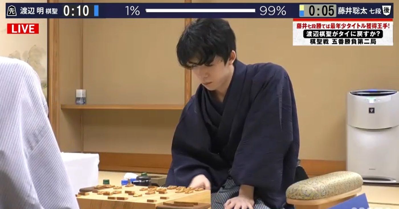 25日9時に始まった対局は26日21時22分に終了。結果は145手で豊島名人の勝ち。七番勝負は渡辺挑戦者1勝の後、豊島名人の2連勝。35手目 ▲3五歩で2、3、4、5筋の位を取って、豊島さん優勢の局面。この局面から豊島玉が入玉するとは想像できなかった。それだけ渡辺さんの勝負師としての熟達のワザが凄いということか。銀交換の過程で豊島名人が打った角は中段に出て、渡辺玉への王手。玉を逃げた手に対しては(61手目)▲6六角と元の位置に引き、これがまた渡辺玉をにらむ。渡辺さん「じっと▲6六角と引かれる手が見えてなかったんで・・・。うーん、なんかそこで完全に長考になってもう・・・そこの長考のところははっきりダメになったかと思いました。角引きまでは、まあまあわるいんでしょうけど、はっきりはしてないかなと思ったんですけど、ちょっと単に角を引かれて、はっきり困ったという長考でした、そこは」苦吟1時間4分。62手目、渡辺さんはじっと玉頭の歩を取り込んで、相手に手を渡す。形勢は再び、豊島名人良しがはっきりしてきたのではないか。そう思われたところから、渡辺さんは手段を尽くして勝負に出る。渡辺挑戦者は飛車取りを逃げず、角金金銀が利く相手陣の焦点に金取りで64手目 △5七歩を打つ。82手目 △6六角成。挑戦者が名人の角を取りながら角を引き成ったところでは、飛銀馬と3つの挑戦者の駒が名人の3枚の歩で当たりとなる、すさまじい図。将棋は一手ずつしか指せず、3枚の駒を一度に取ることはできない。98手目 △7八金打。挑戦者はわずか2分の考慮で、王手で△7八金と打つ。これは名人が「見逃していた」という勝負手。▲同金と取らせることによって、豊島陣の急所にスキができた。挑戦者は100手目△5七金。もう1枚の金を打ち据えて、名人の玉に迫る形を作る。この後も激戦は続くが、豊島玉は渡辺陣の歩の裏にまで143手目 ▲6一玉と潜り込んで、詰まず。中盤に打った8一銀、8三歩が玉を守る駒に「大躍進」。
