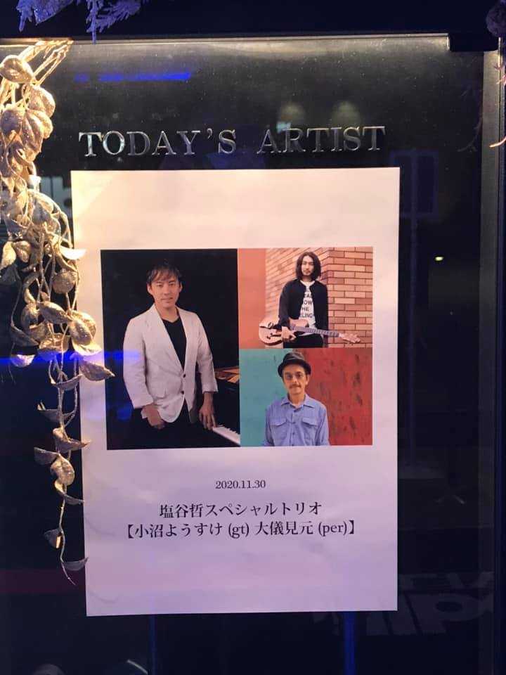ダブルヘッダー2戦目はBillboard Live YOKOHAMA!<< 2020年11月27日(金)塩谷 哲 with ソルト・ストリングス コンサート2020@銀座ヤマハホール>>に続き、SALTさんの2Days。ヤマハはクラシックのAuthenticな響きだったが、今日はサルサのBeatがタップリのラテン、カリビアン。ヤマハで聴いた「3.オシャレの達人」、「4.Beauty and Brilliance」も今日は全く別の曲だった。MCで「楽器ではなく、人で選んだトリオ」とSALTさんが言われた通りの「一期一会」でしか奏でることの出来ないトリオの音。「音楽で何が人を感動させるのか?とよく考える。音の良さもあるけど、やっぱりRealityじゃないか、と思う。昔、NYのBlue NoteでRay Charlesを聴きに行って、「をを、こんな近くにRay Charlesがいる」と思った。Rayの音楽も素晴らしかったけど、Rayの生き様を感じられるRealityさが一番胸に沁みた」。そんなSALTさんの言われた「3人のRealityさ」に溢れたライブ。また、お聴きしたい。再演熱望!<< 2020 Nov 30th 塩谷哲スペシャルトリオ 2nd Show@Billboard Live YOKOHAMA>>塩谷 哲 / シオノヤ サトル (Piano)小沼 ようすけ / オヌマ ヨウスケ (Guitar)大儀見 元 / オオギミ ゲン (Percussions)1.A Brand - New Day2.Delicious Breeze3.オシャレの達人4.Beauty and Brilliance5.What Can We Do6.Fellows7.?Enc8.?以下、Billboard Live OSAKAでの11/20(Fri)ライブから