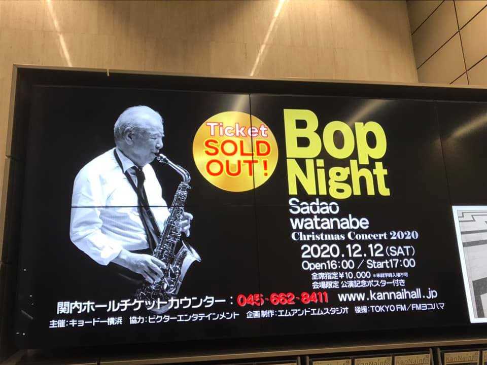 本日は関内ホールまでナベサダさんのBop Nightを聴きに参上!発売開始からすぐにチケットは売り切れ。しかし、昨今の厳しい感染状況から「泣く泣く」今日のライブに参加するのを断念した方も結構おられたようで、空席もチラホラ。ナベサダさんはこの状況でライブに来てくれたファンへの感謝の気持ちで、他のライブ会場より多めに吹いていただけたようだ。明日のオーチャードホールも当然参戦予定。<< 2020 Dec 12th CHRISTMAS CONCERT 2020 Sadao Watanabe BOP NIGHT@関内ホール>>渡辺貞夫(as)小野塚晃(p), 粟谷巧(b), 竹村一哲(ds)HORNS: 村田陽一(tb, arr), 西村浩二(tp, flh), 奥村晶(tp, flh), 小池修(ts)1st1.ONE FOR YOU2.RE-BOP - with HORNS3.I MISS YOU WHEN I THINK OF YOU - with HORNS4.ONLY IN MY MIND - with HORNS5.WHAT SECOND LINE - with HORNS6.TREE TOPS7.NOT BEFORE LONG8.GEMMATION - with HORNS9.SONG OF MAY - with HORNS2nd10.TOKYO DATING - with HORNS11.FOREST SONG - with HORNS12.COME TODAY - with HORNS13.CYCLING - with HORNS14.I THOUGHT OF YOU15.SIMPÁTICO16.MANHATTAN PAULISTA - with HORNS17.EPISODE - with HORNS18.AIRY - with HORNS19.LIFE IS ALL LIKE THAT - with HORNS20.SONHO DE NATAL(CHRISTMAS DREAM) - with HORNS21.CARINHOSO - ナベサダさんと小野塚さんのDUOEnc22.HANAWA SAKU23.RHYTHM A NING