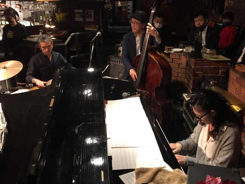 << 2020 Dec 19th Crystal Kay Crystal Xmas 2020 1st Show@ Billboard Live TOKYO>>を観た後は、吉祥寺に移動。大西順子カルテットを聴きにsometime参上!ピアノトリオに大儀見さんのパーカッションが加わって、より豊潤な深みを増した音。トリオの音を繊細に聴き取って、その音に対してある時は鋭角に、ある時は包み込むように大儀見さんのワザが繰り出される。トリオの定番曲「1.Golden Boys」、「2.Essential」、「7.Meditation For A Pair Of Wire - Cutters」、「9.Very Special」も新境地を切り拓いていた。順子さんの愛する桃ちゃんをテーマにした「3.Teenager」。管なしでお聴きしたのは初めてだと思うが、「をを、こうなるんだ」と思いながら拝聴。白眉は「8.Chicago」、「10.Manteca」。トリオでの躍動感が、大儀見さんのパーカッションで度肝を抜かれる世界を疾走。今日sometimeに来場できなかった方は次週、12/26 Blue Note Tokyoで「JUNKO ONISHI QUARTET」の公演があるので、参戦されることをおススメする。2nd ShowはLive Streamingもあるので、「ライブ会場に行くのは暫く控えたい」と思う方はLive Streamingでも楽しめると思う。詳細はコチラ→ http://www.bluenote.co.jp/jp/artists/junko-onishi/<<2020 Dec 19th pf大西順子カルテット featuring 大儀見 元perc@吉祥寺sometime>>大西順子(pf) 井上陽介(b) 吉良 創太(ds)大儀見 元(perc)1st1.Golden Boys2.Essential3.Teenager4.Fast CityEnc5.Winter Wonderland - vo 陽介さん6.The Christmas Song - vo Wornell Jones2nd 7.Meditation For A Pair Of Wire- Cutters8.Chicago9.Very Special10.Manteca- per大儀見 元さんとds吉良君のバトルイントロからEnc11.Winter Wonderland - vo 陽介さん(参考)大阪のbilboard LIVEの写真。この時のドラムは高橋直希君。