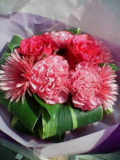 今日は5年目結婚記念日。結婚記念日だからといって、仕事が休みなわけでもなく、今朝も、主人はいつもどおりに仕事に行った。午前9時ごろ、子供と一緒にTVを見ながらご飯を食べていると、「ピンポ~ン!」とチャイムの音。宅配便が来たようだ。さてさて、「誰からの荷物かな??」と、差出人を見ると・・・ん?主人??中を開けてみると、★花束だ★主人からのサプライズプレゼント!素直にうれしかった。