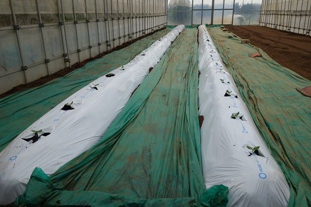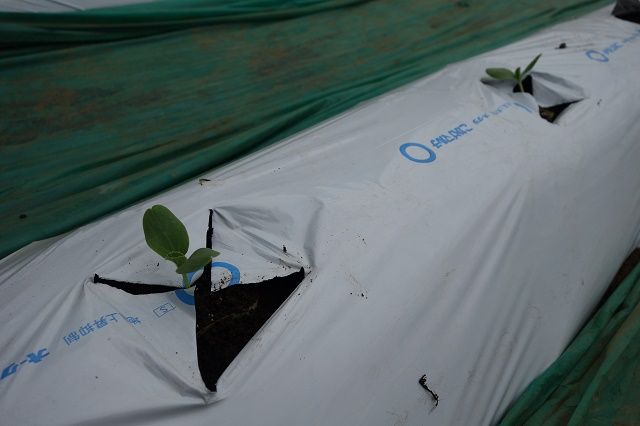また、マルチの畝間にビニールを敷き、水分の蒸発を抑える効果と湿気が上がって苗にウドン粉病が発生するのを抑える効果をねらいます。