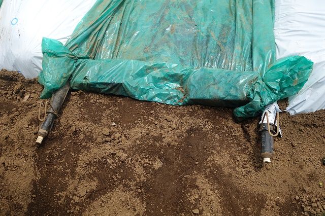 マルチの下には灌水チューブが埋設してあり、盛夏のさ中に土壌の水分補給をします。