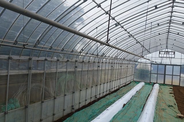 畝の真上には鉄パイプを吊るし、畝までビニール紐を垂らしてメロンのツルをからませますが、この作業はもう少し先になります。
