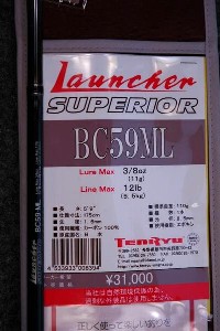 この前ロッドを買ったばかりなのですが、またロッドを購入してしまった。TENRYU Launcher SUPERIOR BC59MLヤフオクを見ていて新品が5000円から出展されており、残り20時間位でも5000円のままでした。終了時間が平日朝の8:00過ぎだったので、ひょっとして安く落とせる?と思い、急遽入札を決めました。出勤のため自宅を出るのが8:20なので、なんとか入札できる時間です。翌朝の8:10頃には6010円に値上がっていましたが、6260円で落札することができました。送料込み:7310円で新品のロッドが購入できました。このLauncher SUPERIORシリーズですが、一時期このシリーズで全て統一しようかと考えてた位、非常に気に入っております。細部の作りは、はっきり言ってお粗末なのですが、飾りっ気がなく、シンプルで軽量。とても良いロッドです。数年前、やたらと高弾性ロッドが世に出た頃、天龍さんら発売された高弾性ロッドです。ポパイで1本購入したとき、ポパイの店員さん曰く「テムジンより高弾性ですから・・・。」との事でした。ホントかいな?今はスピニングのSP60LとSP60MLを所有しておりますが、以前はSP60ULとSP64ULも所有してました。SP60ULは根掛かりを外そうとしたときに破損、SP64ULはエンジンで移動中に破損。あっさり2本とも折れちゃいました。これも高弾性ロッドの宿命なんですかね。それでもSP60ULは安く買えるのであれば、再購入したい位です。このBC59MLは「4”ヤマセンコーが使えれば・・・」と思ってます。よっぽどの事がない限り、ボートに積むスピニングロッドは2本です。その2本には、大体ジグヘッドとネコリグが結ばれており、4”センコーが使えるベイトロッドが欲しかったのです。ミディアムクラスのロッドでも遠投はできますが、私の腕では近場を正確に撃つ事ができません。で、少し柔らかめのロッドを購入しました。この日曜日に試投を予定してます。