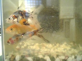 一昨日の事、私の不注意で金魚を死なせてしまいました 昨年の夏から飼い始め、黒の出目金はすぐに死んじゃったのですが、残り3匹は、一年間元気でした。餌を与えた時に、濾過ポンプを止めており、そのまま8時間くらい、電源を入れ忘れちゃったもんだから、酸欠で、大きい2匹が死んじゃいました。かろうじて、一番小さい金魚だけは生き延びてくれました。今日、ホームセンターで新たな仲間(上下の2匹)を買ってきました。この2匹は、子供達が気に入ったのを1匹ずつ選びました。