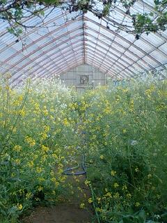 うちのハウスはお花畑。黄色や白の背の高いのは大根や白菜の花。種採り用に放置しています。