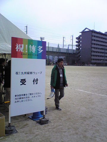 久々の書き込みです。3/12は 九州新幹線開業でーす。めでたい。新幹線の現場に携わってきたものとして おめでとう!です。ということで 2/20は 開業記念 祝 九州新幹線ウェーブ に参加してきました。詳しくは ここ おしてみてねふふふ どれくらい 変わった 格好の連中がくるか 期待感いっぱい!おおう 集合1時間前から(新幹線通過撮影 2時間半まえ)から 結構人がくるじゃんうん うん さいこー祝 かいぎょうー 東北にもまけませんきたー 博多もこういう方もいるんですね。でも お祭りですから OK!この会場で1000人くらいらしいようやく 九州は鹿児島~博多~新大阪が 1本でつながります。なんか 暗い話題ばっかりだけど ばかさわぎすりゃ 景気もようなるんじゃないかなぁ。こー ぱーっといくぜ みたいなのが 今の日本には少なすぎる気がするなぁ。
