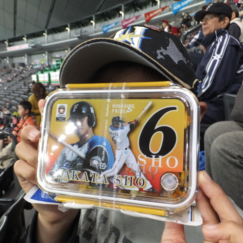 昨日に引き続き行っていちゃいました~。甥っ子とデートです。そして何故か今回も弟の送迎付き・・。「中田翔のホームラン弁当」1300円也!!お弁当箱はプラスチック製で再利用可。甥っ子は「今度野球の練習の時これに入れてもらう!!」と言ってました。数年前に稲葉選手バージョンがありました。今年はこのほかに陽選手バージョンもあります。初回に先発浦野投手失点しましたが、その後の粘りのピッチングと野手陣の地道な得点で、最後はサヨナラ勝ち鳥肌ものでした!!ヒーローインタビューは陽選手と西川選手。とてもユニークなインタビューでした。甥っ子と行ってしばらくぶりの勝ちゲーム。声を張り上げ応援歌を歌う甥っ子を見ると、おばさんは「また頑張って働いて(苦笑)連れてこよう。」と感じたのでありました