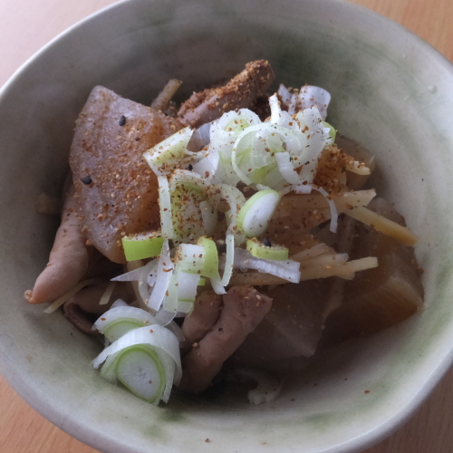 昨日仕込み一晩寝かせたモツ煮込みが今夜の肴。材料はシンプルにモツ・大根・生姜。生姜LOVEの私は生姜も具材になるほどたっぷり入れます。日曜日恒例の早めのお風呂でたっぷり汗をかいた後の晩酌スタート。ホッピーと煮込み。何だか居酒屋のカウンターみたいでしょ