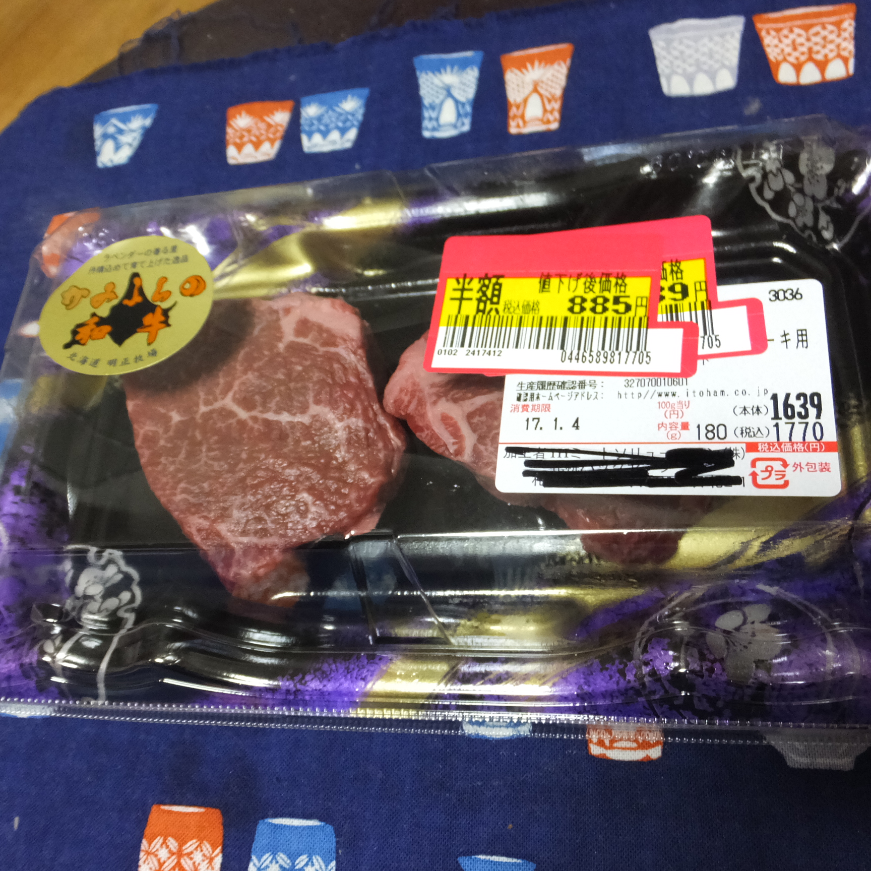 カレンダーどおり2日月曜は仕事に出ました。電話応対が全くなくサクサク仕事が進んでしまい、4日の世の中の仕事始めまでは取引先からの連絡や対応が無いため片づける業務がありません。ってことで急遽お休み頂きました!(この分はどこかの休日出勤か・・)年末の買い物で忘れていたものがあったのでちょっと買い物に出まして、そこでゲット~!!半額でも普通じゃ絶対買わない(笑)でもお正月だから~なんて、自分を甘やかしカゴにIN。さて、豪華晩酌スタートです。ステーキ肉は常温にしてからと聞いていましたので、塩コショウをし少し置いておく間にサラダを食べます。表面しっかり焼いてそのまま放置。するとしっとりミディアムレアに仕上がります。しっかり塩コショウをして焼いたので、ワサビだけで十分。赤ワイン開けてゆるり・・。美味しいお酒とお料理は私の活力。さて明日からまた働きましょう(笑)