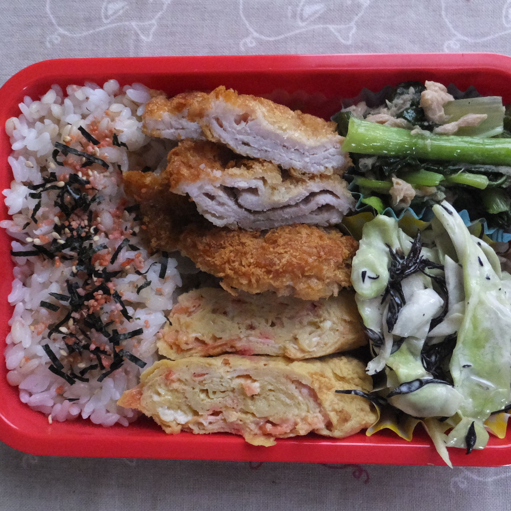 涼しくなったので、お弁当復活。ご飯(もち麦いり)トンカツ(薄切り肉を重ねてます)卵焼き小松菜とツナの煮びたしキャベツとヒジキの和え物