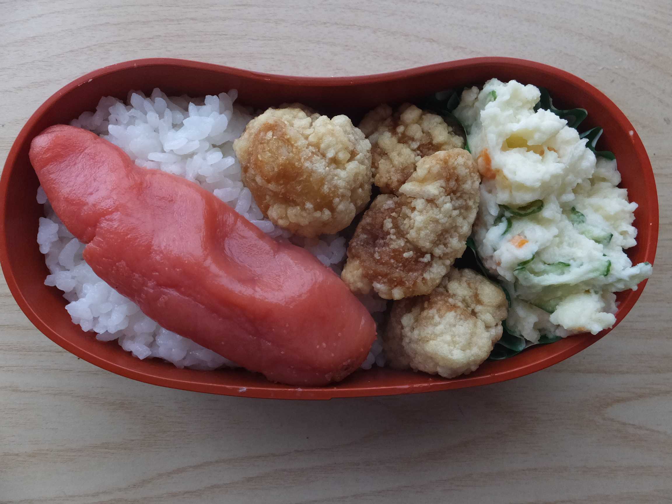 タラコご飯、鶏から揚げ(冷凍品)、ポテサラ(お惣菜)