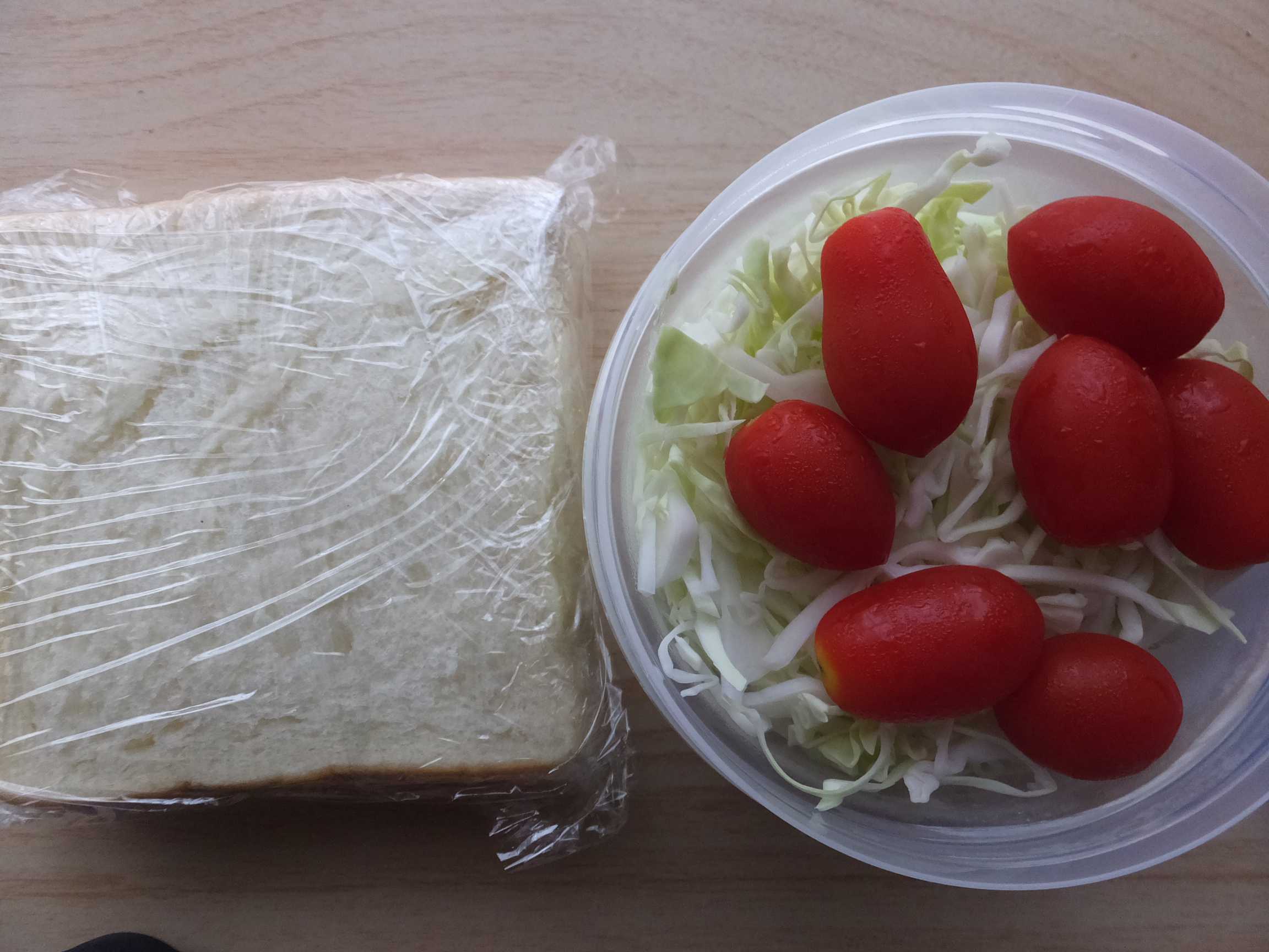 卵焼き、トマト、マカロニサラダ、ほうれん草と揚げ玉の和え物、つくだ煮、梅干