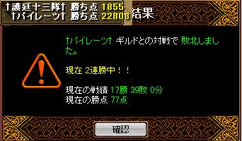 今日のあいては CrossGard†なんで今年初の相手がこんな強いんだよ(TДT;)最終結果 護廷 1373対4883 Crossgard今回の得点ランキングはふもっふ先生 718☆☆☆☆☆ 655 だけなのでカット失点ランキング~~~~~~~~~~~1位 ふもっふ先生 3回死2位 フィロン 4回死3位 氷帝† 1回死4位 邪拳 4回死レベルが高いって損ですね^w^僕は4回死んでも4位です