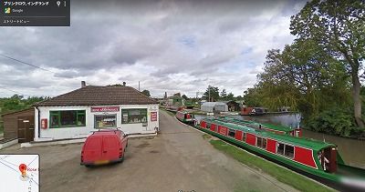運河に沿って白い矢印はガソリンスタンド、赤い矢印はナローボートの