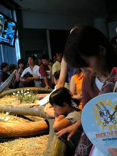 ホールはブルーとオレンジに別れ、たまたま並んでもらった券がブルーだったので、ブルーホールをみる。マンモスだけ見るコースもあり。ブルーホールで、20m×50mの2005インチスクリーンで現在の地球についてお勉強。マンモスの牙にタッチ。(オレンジホールは、月の石が見られる)