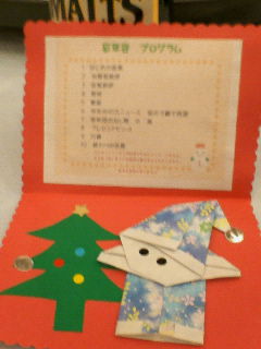 ということで昨日はお騒がせシマリス。で、忘年会の様子をば。えーっ。酔ってて良く覚えてません。はは。ビール飲んでワインが出たんですね。白好きなもんでついつい、調子こいて飲みました。他のアルコールと違ってすっと飲めちゃうし。後味も良いものだからいつの間にか手酌までしてました。はは。バカでーす。席札です。ひっくり返すと次第とサンタさんです。こういう手作り物はいつもある。で、出し物はお約束の10大ニュースということで学校でのニュース・・。あーーっ。ほとんど覚えてません。陸上水泳でどっちもリレーで優勝したとか。携帯持っていない先生がついに買ったとか。全国大会に出場した子が何人かいるとか。ベスト1覚えてませんから・・・。番外編思い出しました。講師の先生が本採用の見込みがたったこと注 これ、ずっと前、本人から、決まってすぐトイレでジョーってしながら教わりました。もう一つは海外派遣へ行く先生がミラノだって。紛争中の国に行く覚悟していたんだけど。って。注 これも仲良しの先生なので前に教えてもらっていた。前からいた先生で知らない先生があって、何で俺だけしらないだあと、怒っていたことがあった。私も実は一昨年まで希望出していたりして・・。さて、その10大ニュース低学年チームがコントで紹介していくっていうやつでさすが先生やっている人たちで注 考えたら趣味というかなんというか、舞台に立っている先生もいたっけ。とにかくアドリブで・・。で、次が中学年の小芝居とゲーム。注 順番違うかも。怖い先生役の先生とダメな生徒達みたいな。注 実際に怖いと私は思う。で、滅茶苦茶厳しいあれドラマにそんなのありました?そのパロディーのようです。私見ていないので・・・。せんだみつおゲームとか、アンガールズゲームとか、あるある探検隊を突然ふられたり。その中で他界がやったのが昨日の日記に書いた古畑任三郎の物真似での、サイコロ事件の謎解きです。何とかフェチっていうのを言わされるっていうところでこうもんフェチだと言ったらひかれました。日帰り温泉のサウナで見ちゃうくらい。水戸黄門好きとか・・言ったら。「フォローが遅いっ!」と厳しいツッコミが・・。当然と言えば当然。はは。酔っぱらいですから・・。で、有志でやったゴリエダンス。指導は学年の相方。動いているのは撮りにくい。新携帯の欠点?私参加してませんよ。観客の方がいなくなっちゃう・・ってか。仕事地獄でしたからとてもとても・・。が暇だったら参加していると思う・・。はは。けっこう真剣に踊ってました。二回の練習でここまで踊れると言うだけでえらい。控え室でのシーンがあったので撮影。金髪・・男の先生。他にもすね毛丸出しの先生が・・。着替え中を見てしまった・・。男子はトイレで更衣していたので・・。けっこう不気味でした。はい。男とわかっていてもドレス着ていると目がいってしまう悲しい性です。注 性→「さが」と読んでね。去年はやはりマツケンサンバだったと・・。はは。何処もおなじ。ということで二次会にまた出かけダイエットとは名ばかりでたこ焼きチーズフォンデキムチなど召し上がりはは。グレープフルーツシャーベット同ジュース水割り熱いお茶赤ワイン・・ちっと。飲んで。結局なんやかやしていて帰ったのは2時近く・・すぎていたか?日記更新して読書ちと、夜食はは。だめだめちゃん。寝たのは4時頃だったか・・。8時頃からもぞもぞとそれでもちっと仕事して。現在に至る。あっと、仕事より溜めたレスの方がたくさん時間かかったかも。レス率100%。手抜きはしていません。一つ一つのコメントにきっちりレスしました。たぶん・・・。是非御一読ください。今夜はちとサイト回りをしています。よろぴくね。