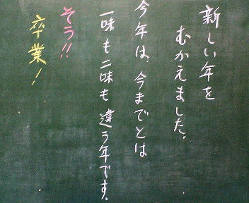 「他界の新年のめあて」↑すでにタイトルとちがうじゃん。というわけでまずはカミさんのピアスどうなったでしょう。はい。まだ未確認です。今から見てきます。つけて↑ここまで書いて子ども部屋に見に行ってきます。つけていた・・・かわかりません。って風呂に行ってました。のぞきに行くとぶん殴られるので寝室に行って箱を捜しました。鏡台の引き出しにあるのを発見。もしかしたらダイヤとルビーが入れ替わっているかと・・・。ちっ。ダイヤでした。まだ明らかにつけていません。明日はいよいよ。一言言ってみます。「バーロー。」じゃなく。皆様から聞いた中からまず一つ。ダメなら明後日にまた一つ。と・・。このままだと31日までは無理っぽです。年内派の方に申し訳ないので頑張ってみます。さて。今日のテーマは新年のめあてです。ってまだ考えてないんですが。毎年それなりのものを考えます。で大方めあてとして成立しないのが「今年こそ○○をする」とかいうパターン。だいたい今までできなかったことが年が替わったからって突然できるわけがないのでできるだけいままでトライしていなかっためあてを捜すのが得策かと・・・。なんか考えてる方はありますか?さてなんでそんな話を書いたかというと。学校で出す冬休みの計画表なんかには必ずこれありますよね。私のところでも書かせます。娘も毎年苦労して書いてます。ウソ書きます。はは。でそうじゃなくて・・。話は新年子供たちが学校に来たときのこと。そう。今年は年末休めませんでしたので正月フルに休みます。実は損なんですが・・。年休有給休暇は一年のおわりに全て切られます。40日が基本で20日が繰り越されるシステム。だから私みたいに病気しない・・仮にしても学校に行く・・っていう人間は大量に有休があまる。だから年末全部休んでもゆうゆう20日は残るわけで。新年に休むとしっかりマイナスされちゃいます。つっても。有休来年も5日程度しか使わないので同じなんだけど・・。なんの話だっけ?そうそう。新年子供たちが学校に来るとそうそう。黒板に書いてあるでしょ。先生からのメッセージ。で、今のウチに書いておかないと・・。新年早々子どもが来る前に教室であわてて書くことになるので先に書きました。思いつくままの殴り書き修正なし・・。色気なし。でこんなの書きました。↓前半でもって。↓後半まあ。はい。当たり障りがないやつです。が、一月は行く。二月は逃げる。三月は去る。と言われるほど3学期は早い。本当にあれよあれよという間に終了式6年生はあっという間に卒業式。あれ。話がまた変わった。そう新年のめあてクラスの子ども向きバージョン。これも。おまけに黒板の中央に書きました。楽天の皆様向けに他界でいったん書きました。はは。↓はい。例のサイコロキャラメル消失事件の反省をもとに上にサイコロキャラメルのケース乗ってます。はい。今年うっかり気をつけます。と・・。今年こそとつけてないところがミソです。はは。でね。でね。今、卑怯なことを思いつきました。またきっとうっかりしてドジふむじゃないですかあ。すると子供らが追求するじゃないですか。したらば言うんです。「ああ。それ。今年はうっかり気をつけます。って?うんうん。気をつけたよ。書いたのは年末だったので、12月31日までうっかりがないようにしたよ。」だめなら・・。「うっかりはしない・・じゃなくて気をつけるって書いただけだし・・。気をつけたけどやっちゃったんだからしかたないじゃん。」とか・・。うーん。すでに守れそうもないめあてです。では最後に恒例の方言講座です。↑いつから恒例じゃ!「カミさんに顔をちみくられて、男をおやした。」さて、この方言を翻訳してみましょう。「ちみくる」は標準語だと思っていた私。「男をおやす」は非常に訳しづらいのでむりせぬように。はは。
