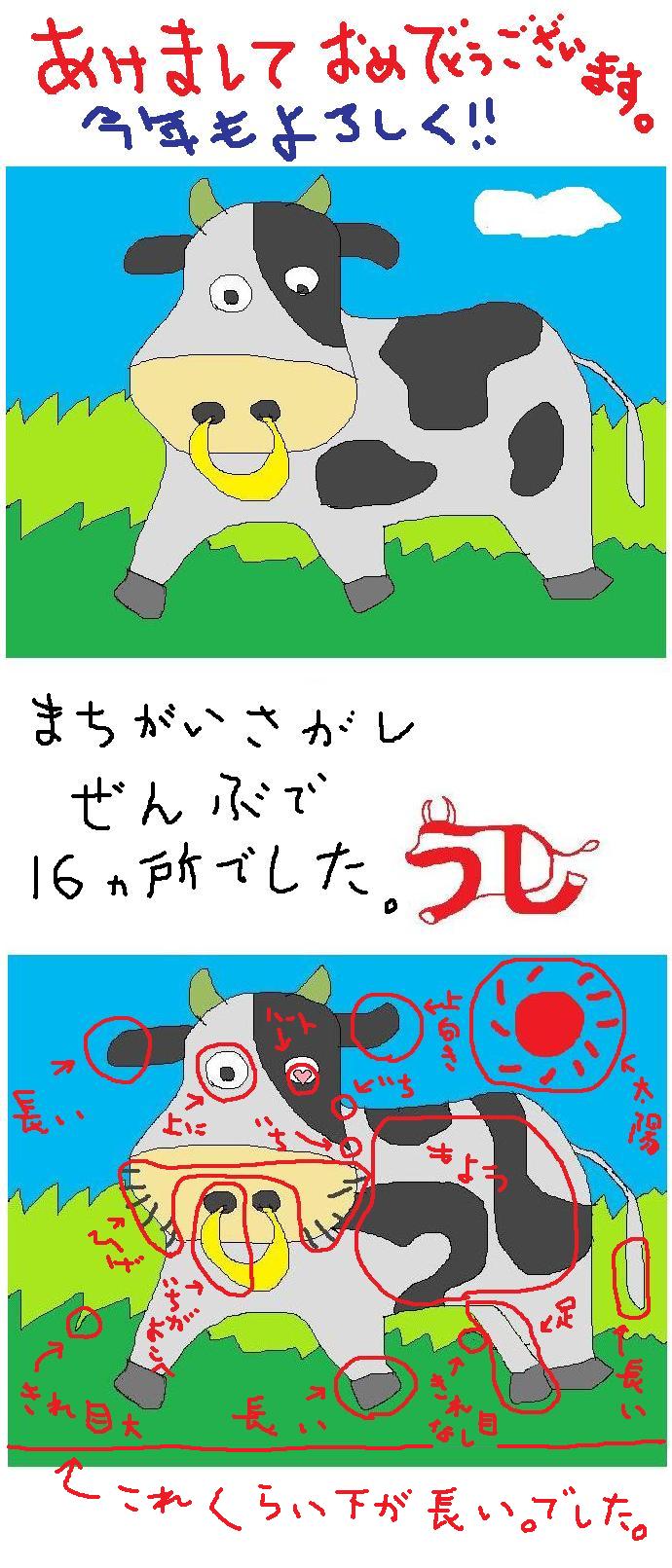 「朝から黄金伝説」ということでまずは間違い探しの解答です。はいはい。かなりやらしいやろー♪特に最後に思いついた下の緑の部分の延長・・やらしいやろーっ。が、頭の生え際の背中・・自分でも忘れていた。○採点見つけた場所の数0個・・・あの見てくださいね。1個・・・あの目を開けてくださいよ。2~3個・・やったあ幼児並みの観察力。こういう人好きです。4~5個・・すごいぞ小学生、ただし低学年。6~8個・・いや、大人です。10~13個・・すみません、真面目に取り組んでもらって、今年はいいことがあります。14個以上・・・すごい天才です。16個・・・・・参りました。超天才と呼ばせてください。ということで昨日元日の朝。部屋に入った私を待っていたモノは・・わおっ!!ワンコのオシッコが座布団に・・げげ・・FBIのジャケットにも・・かかっている。うわわわ・・青島刑事コートにも・・。フェンスを鼻先でこじ開けて・・侵入した模様。朝から・・お洗濯・・。部屋に戻って珈琲・・感動コーヒーというのを買った。フンフンフン♪げげっ。金の延べ棒(他界家ではこう呼ぶ)が2つ。ワンコめ。ウンチまでまったく・・。と消臭除菌スプレーとトレペ・・で。処理・・??????????なんじゃこりゃあああっっっっっ!!!コーヒー用の電気ポットの下に敷いてあるトレイにシミが・・わわわわわわわわっ。電信柱・・よろしくポットにもマーキング。どぁぁぁぁぁぁぁぁ。その反対側のコーヒーセット・・・げげげげっ。「感動珈琲が・・いかんどう!」あわわわわわわわっ。さらに・・タンスの下。「朝から、なんたることだんす。」カミさんに言ったら「よかったじゃん。新年早々運がついて。」とベタなことを言ってますます・・ぶー。そして今朝・・。・・・どこから・・侵入したか。またマーキング。文句言ったらカミさん。「うーん♪ウィンちゃんかわいい♪」・・・だめだこりゃ。ということで皆様にも運がつきますよう。新年早々。ウ○コの話でした。チャオ♪では姪っ子たちが帰ったので、カミさんの実家に行ってきますぅぅ。