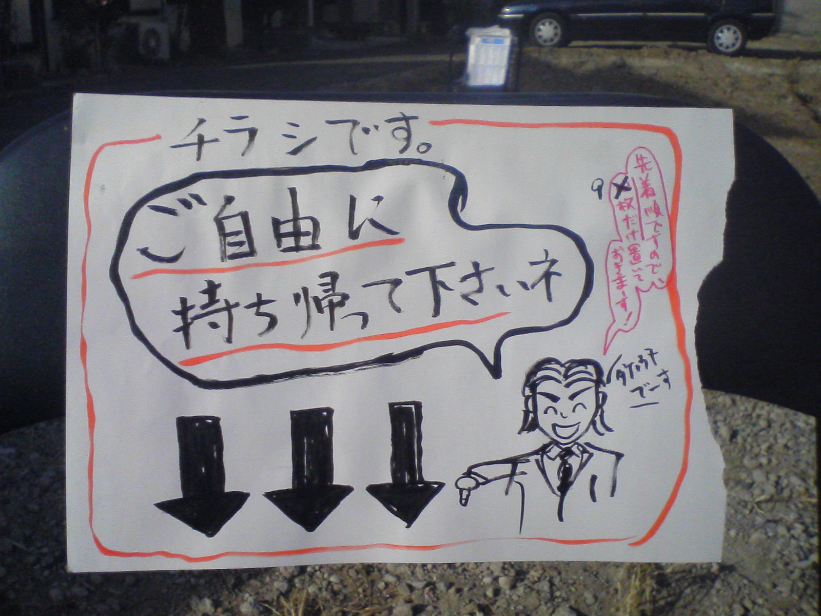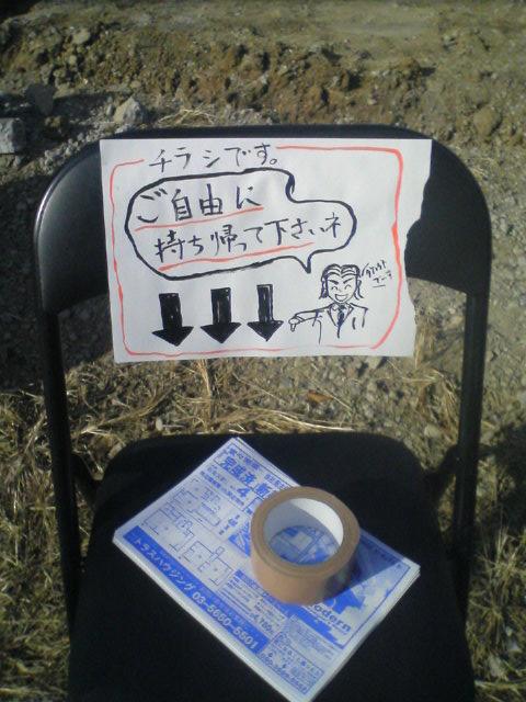その前方2m右手にパイプ椅子を設置し、椅子の背面に「ご自由に持ち帰って下さいネ…」と書いた紙を貼り、座面にチラシを置く。チラシの重しとしてガムテープを使用。
