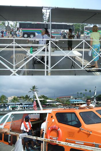 写真はボディチェックの様子とトレジャーボートの後方に写っているコナの町。