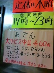 ちょっと前の土曜日か日曜日だったか忘れた久しぶりになんば場外へ馬券を買いに出たパソコンで買えば電車賃もいらないのにと嫁に突っ込まれるのを、ごにょごにょ言いながら出かけるもちろん出かけるには理由があるんだ呑むだけですけども(知ってる)エンジョイエコカード土日祝用600円を購入して馬券を買ったあと平野のあたりをうろうろした山歩きをしたいとはあまり思わないが街歩きは好きだ途中良さげな「いぬい」という飲み屋があったが開店準備中であったのであきらめる場所を移動して御堂筋線「あびこ」この日は我孫子観音の「節分厄除大法会」というのがあってやたら人通りが多く、露店もたくさん出てるこれならどこか呑めそうな店が有りそうだとキョロキョロしたらすぐに見つかったのがこの店通りに面した小売部を脇に入った細い道に立ち飲み部がある、ナイス嗅覚だ。店内は12~13人くらい入れるか、壁に据え付けられたテレビが大きくて見やすいが、ここで馬券の悲しい結果を知ることになろうとは。注文はひや酒(長龍)と、おでんは厚揚げとしゅうまい後で酒追加とゆで卵、お勘定は860円店で働いてるおねいさんが美人だ