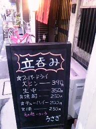 ちょっとした用事ともいえない用事で大正区へ7時頃にはそれも済んで、一杯呑んで帰りますよ駅のぐるりと線路沿いに少し歩いたら何軒かありますね、椅子有り無しの「立ち飲み」その中で満員の海鮮系の店と、並びにあって客の居なかったこちらの店正解は「満員の方の店に行く」でしょうけど、違う方えを選んだりするから会社でもうだつが上がらないんだよな、わし。逆張りなんてするもんじゃない大抵ダメだそうは言ってもこの店、大瓶390円なら文句なしジョッキは微妙に小さめだけど生ビール290円店主がミッチィーでしょうか「ミッチィー」とピンクの文字がプリントされたエプロンはあんまりイケてないぞ端っこに置かれた椅子も高さを増すのにイケてないDIYがほどこされてるなんとなく不器用な様に共感を呼ぶ店なのか頑張れミッチィー!