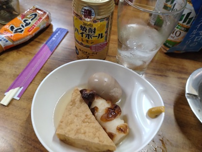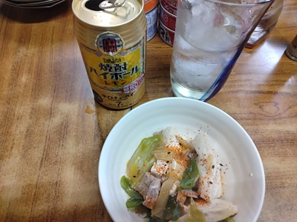 金曜日、今週もなんとかやり過ごした仕事帰りに「中本酒店」さんへ行く混み混みかと思ったら、先客はTHさんだけで週末なのに拍子抜け後からYさん、ゴルゴ、Tさん、OさんOさんが、ちゃんぽんの店「とまと」から具だけを買ってきた次回は麺込みでお願いします、あとから揚げも忘年会に参加するかしないかYさんが値打ちこき過ぎで面倒くさいもう参加せんでええわ他にも蘊蓄を垂れようとするので「何か言ってるで」と女将にバトンタッチゴルゴは何か知らんけどイキってたカツとじ、おでん、 焼酎ハイボール、翠ジンソーダ