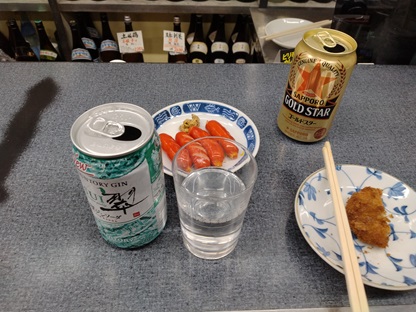 食い散らかしとるな水曜日、終業後、少し遠回りして立ち飲みます翌日の木曜日は群馬の桐生市に出張なので軽く飲む中本酒店に行くと遅くなるので、こちらがちょうど良い隣で飲んでるWさんは自営業で今期は昨対170%達成したとエグいこと言ってた人を募集してるそうだけどなかなか来ないらしい今は難しいよね何ならわしが立候補したいわビール風、翠ジンソーダ、赤ウインナー、コロッケ