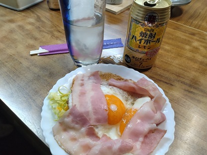 金曜日、仕事帰りに「中本酒店」さんで飲みます先客はたしかSさんとTさん他にもいたように思うSさん、財布の居場所が分からんと焦ってるタクシーにも乗ったそうでタクシー会社に問い合わせはたまた仕事用のカバンに入れたかもしれんと、しっかりしろ結局、確認に家に戻って仕事用のカバンにあった家に戻ったついでに芋焼酎は飲まないからと、わしにくれた1本はTさんにとられた、赤霧島焼酎ハイボール、ベーコンエッグ
