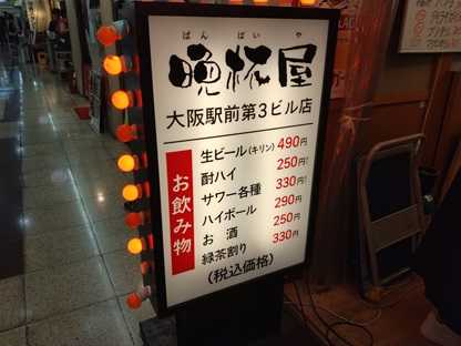 大阪駅前ビルツアー3軒目は「晩杯屋」さん駅前ビルで飲むときは毎回同じ店に来てる感じ「庶民」さんか「晩杯屋」さん、共通するのは安い事しかも晩杯屋さんではだいたいバイス飲んでるな卒バイスも検討したいバイスセット、中おかわり、煮込み、レバカツ、ガツ刺しアテも毎回同じような感じでビビるわ