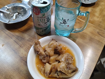 週末金曜日、どこで飲むのか考えるのが楽しい「得一」にしようかと悩んで「平酒店」さん店に着いてから思い出した、金曜日はVIP席グループの日だった店の外まで声が聞こえる、賑やか過ぎこの日は7時前にはグループさんはお帰りというか他の店で飲むみたいで帰ってったEさんがカウンターで飲んでる他には広島から来たお客さんとお連れさん、後2名さまわりと早い時間に飲んで帰るお客さんが多いなこの店瓶ビール、ハイボール、クジラ赤身、手羽先2個