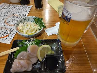 ビール1、チューハイ2、貝柱刺身、スパサラ