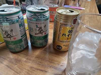 ジンソーダ翠2、宝焼酎ハイボール1、おでんの残り物みたいな煮物
