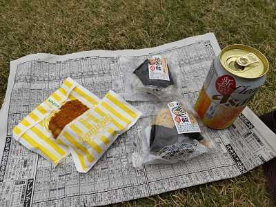 昼飯は馬場に着く前に買ってった、おにぎりとファミチキ