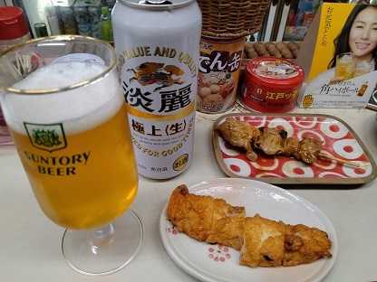 淡麗と焼酎、アテはタコ天と焼鳥1こ