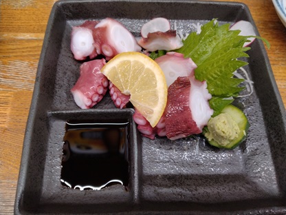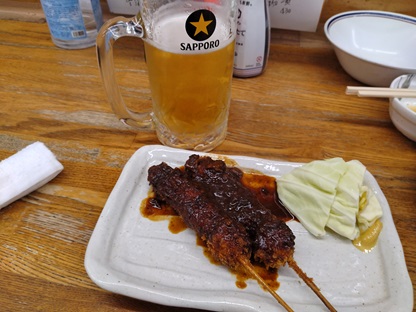 生ビールと瓶ビール、ドテ串カツ、手羽先唐揚げ、鶏肝串、タコ刺身