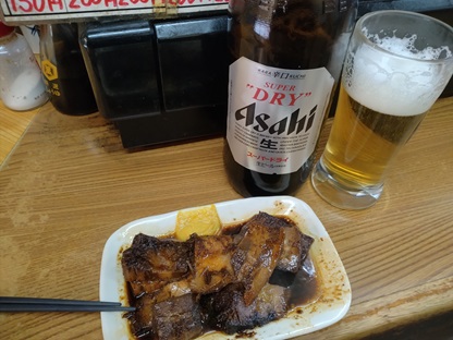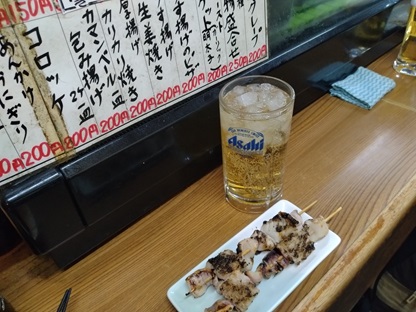 瓶ビール、ハイボール、焼豚、ゲソ塩焼き