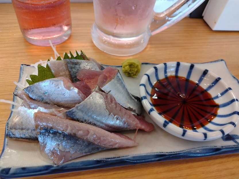 バイスセットと中おかわり2、さんま刺身、レバフライ