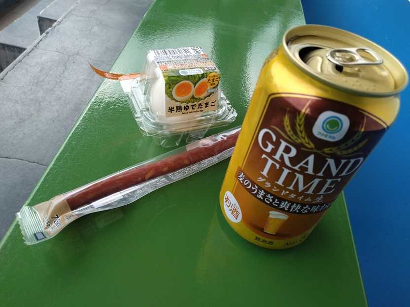 わしは大和西大寺駅で買っておいたビール風とゆで卵、サラミがおやつ