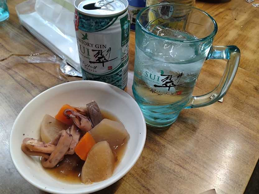 京阪に乗って萱島駅かっぱえびせん好きやねぇこの日、二軒目は「大塚酒店」さんK隊長が奥で飲んでた、偶然ですねわしの勤める会社に、昔にアルバイトで働いたことがあるとおっしゃってたおじさんどうやら、大和田駅前にあった立ち飲み店のオーナーだったそうで偶然にも程がありますね、わしにK隊長も、その店で飲んだ事ありますよいつもは氷結無糖を飲んでいるけど、この日はジンソーダ翠だったんだなアテはおでんの春菊をいただきましょう