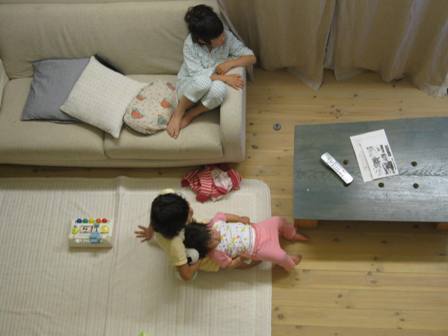 うちの子供たちがくつろいで、テレビを見ているところです。 吹き抜けから撮影しました。3番目は、だいたい誰かのお膝をソファー代わりにして、どーんと座っています。そんな光景を見ると、3人目を産んでよかったな~と思います。ここ3日くらいは、38~39℃くらいの熱が下がらず心配です。(よくあるのですが…)早く治ってほしいな~!お仕事も行けないしな~。