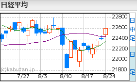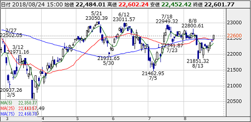 日経平均は、4日続伸した。23日の米国市場では米中貿易摩擦やトランプ政権の「ロシア疑惑」に対する懸念から積極的な買いが手控え、NYダウは76ドル安と続落した。一方、 為替市場では米利上げ継続観測が広がり、円相場が1ドル=111円台前半まで下落 。本日の日経平均は円安を好感して73円高からスタートした。パウエル米連邦準備制度理事会(FRB)議長の講演を控え売買は低調だったが、日経平均は円安進行を支えにじりじりと上げ幅を広げ、この日の高値圏で取引を終えた。