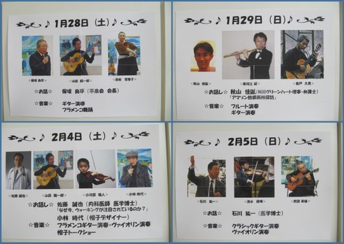 平泉展ミニライブ、第二弾、1月29日(日)は、司会させていただきました。この日のメニューはこちらでした。ギャラリーミニライブ1月29日(日)1 posted by (C)yumibearたくさんの人が集まってくれました。最初は、「アマゾンのお話」。弁護士の秋山先生(NGOグリーンハート理事)が「アマゾン熱帯雨林探訪」のお話を、スライドを使ってしてくださいました。ギャラリーミニライブ1月29日(日)3 posted by (C)yumibearアマゾン探訪の写真をパネルにして、平泉展にご参加くださいました。ギャラリーミニライブ1月29日(日)4 posted by (C)yumibearなんと!アマゾン探訪の旅、お子さんと一緒に行かれたんだそうです。スライドでは、息子さんの元気な様子が映し出されていました。ギャラリーミニライブ1月29日(日)5 posted by (C)yumibearアマゾンの話は、ミニライブの時間では短すぎました。また機会があったら聞いてみたいと思いました。この日のライブは、毎年皆さんが楽しみにしているフルート演奏。今年は、フルート奏者の寒河江誠さんが、ギタリストの青戸久男さんと共演されました。ギャラリーミニライブ・フルート寒河江さん1 posted by (C)yumibear寒河江さんのフルートライブの司会は、昨年もさせていただいたのですが、フルートの音が、天井の高い美術館に広がり、音がスーッとフローリングの床を駆けていくのです。聴いている人を魅了する音♪昨年のライブ日記はこちらです。2011年01月29日 国立新美術館内の会場イベント報告。お話やフルート演奏の司会をさせていただきました。 昨年はフルートのデュエットでしたが、今年はギターと合わせて・・・寒河江さんのフルートが素敵なのはもちろんですが、青戸さんのギター、すごくかっこよかったです。もっともっと聞いていたかったライブですが、あっという間に時間が過ぎてしまいました。寒河江さんに、「日記に書きます」と言って、曲目を書いていただきました。こんなに演奏していただきました。(もっとアンコールしたかったけど)シモネッティ・・・マドリガルショパン・・・ワルツOP69-1マルティーニ・・・愛の喜び花まつりコンドルは飛んでいくタレガ・・・アルハンブラの思い出ベーム・・・うつろなこころ変奏曲ボロディン・・・ダッタン人の踊り今回は縦笛の演奏もありました。(打ち上げの時に触らせていただきました。)ギャラリーミニライブ・フルート寒河江さん2 posted by (C)yumibear保坂先生のお話も合間にありました。また来年も、平泉展でライブをしていただきたいと思います。この日、ゆみのおすすめで、テディベアテラスの皆勤賞のまり子さんがお友達と、寒河江さんのフルート演奏を聴きに来てくださいました。ゆみは司会をしていて、ゆっくり話せなかったので、あとから電話でお礼を言ったら、フルートライブ、本当に感動したと言っていました。そして、ゆみの司会ぶりも、初めて見てくれて、「安心して観てられたよ。」「友達が、彼女本当に楽しそうに司会をするのね、と褒めていたよ。」と言ってくれました。「ゆみちゃん、あんなに出来たらやっぱり頼まれるわよ。」と言ってました。・・・ちょっと安心した・・・楽しそう・・・っていうのは、本当にゆみは自分が楽しいので、きっとその通りなのでしょう。まず一つ目のライブ司会、無事終了しました。昨年に引き続き、記念撮影。ご出演ありがとうございます。ギャラリーミニライブ1月29日(日)記念撮影 posted by (C)yumibearまだギャラリーミニライブ、あと二回分レポートしますね。日本ブログ村のランキングは にほんブログ村 FC2ブログランキングは こちらはインテリア・雑貨部門! クリックお願いいたします ブログラム登録してみました。