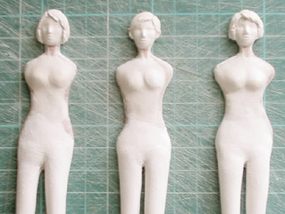 これら脚と胴体の接合部、髪の毛が乾いてからサンドペーパーやスポンジ研磨剤で削って形を整えて行きます。殆ど削って形を作る割り合いの方が多いくらいなのです。